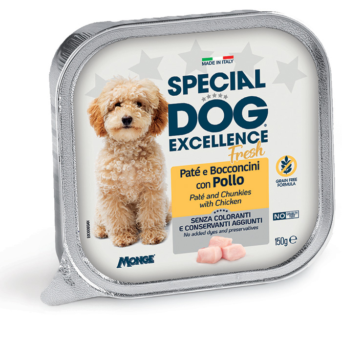 SPECIAL DOG EXCELLENCE FRESH PATÉ AND CHUNKIES WITH CHICKEN is a complete food, which combines a creamy steam cooked paté with flavoured oven cooked chunkies. Specially designed to offer your pet a balanced nutrition with the addition of vitamins A-D3-E. No added dyes, preservatives or sugar. Made in Italy and No Cruelty Test.