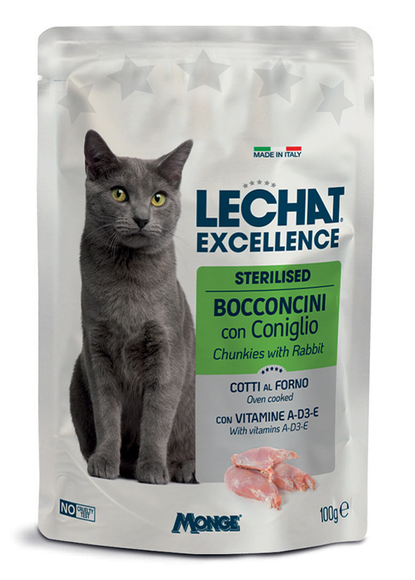 LECHAT EXCELLENCE BOCCONCINI CON CONIGLIO sono un alimento completo per gatti sterilizzati di età superiore ai 12 mesi. Una deliziosa ricetta Made in Italy, senza coloranti, conservanti artificiali e zuccheri aggiunti.
