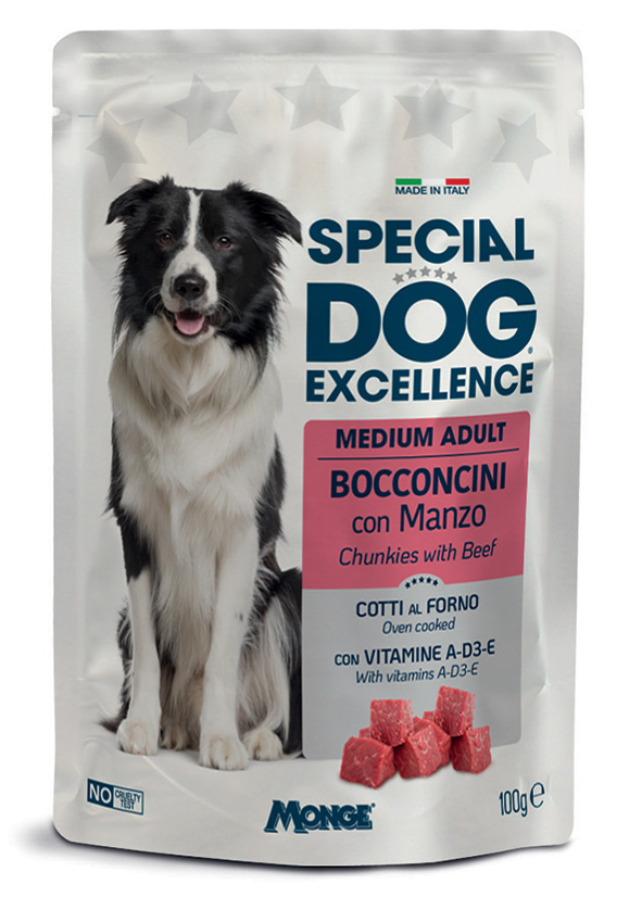 SPECIAL DOG EXCELLENCE BOCCONCINI CON MANZO è un alimento completo per cani adulti di taglia media, di età compresa tra 1 e 8 anni. Una deliziosa ricetta senza coloranti, conservanti e zuccheri aggiunti.