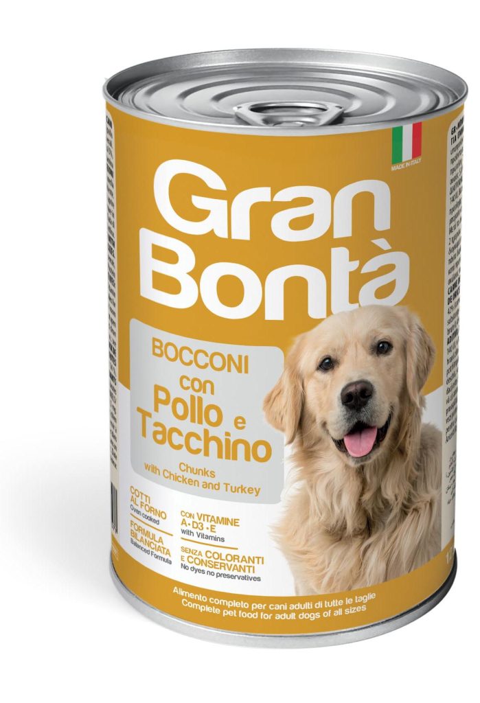 GRAN BONTÀ CANE BOCCONI CON POLLO E TACCHINO è un alimento completo per cani adulti di tutte le taglie. I gustosi e delicati bocconi cotti al forno, sono formulati con ingredienti facilmente digeribili come la carne di pollo e tacchino, fonti di proteine e minerali, per supportare la quotidiana vitalità dei cani. Un’alimentazione bilanciata con vitamine A-D3-E per soddisfare le esigenze nutrizionali degli animali. Senza coloranti e conservanti artificiali aggiunti. Made in Italy e No Cruelty Test.
