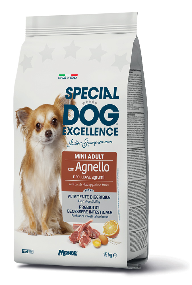 Agnello disidratato (19,5%), riso (15%), granturco, pollo disidratato, grasso animale (olio di pollo purificato al 99,5%), frumento, proteine animali idrolizzate (fegato), polpa di barbabietola essiccata, salmone disidratato, uova intere essiccate (1%), lieviti di birra inattivati, semi di lino (1%), pastazzo di agrumi essiccato (1%), fruttoligosaccaridi (FOS 0,4%), prodotti del lievito (mannano-oligosaccaridi MOS 0,3%), sostanze minerali, yucca schidigera.