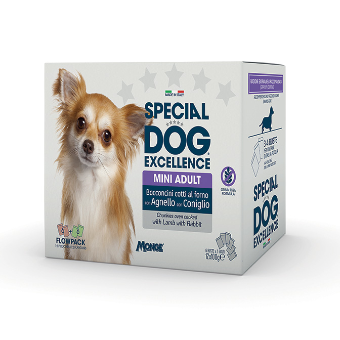 Comodo multipack contenente 12 buste da 100 grammi con gustosi bocconcini in salsa per cani adulti mini in due diversi gusti: