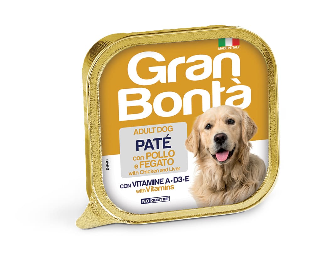 GRAN BONTÀ CANE PATÉ CON POLLO E FEGATO è un alimento completo per cani adulti di tutte le taglie. Un gustoso paté delicatamente cotto al vapore e formulato con ingredienti facilmente digeribili come la carne di pollo e il fegato, fonti di proteine e minerali, per supportare la quotidiana vitalità dei cani. Un’alimentazione bilanciata con vitamine A-D3-E per soddisfare le esigenze nutrizionali degli animali. Senza coloranti e conservanti artificiali aggiunti. Made in Italy e No Cruelty Test.