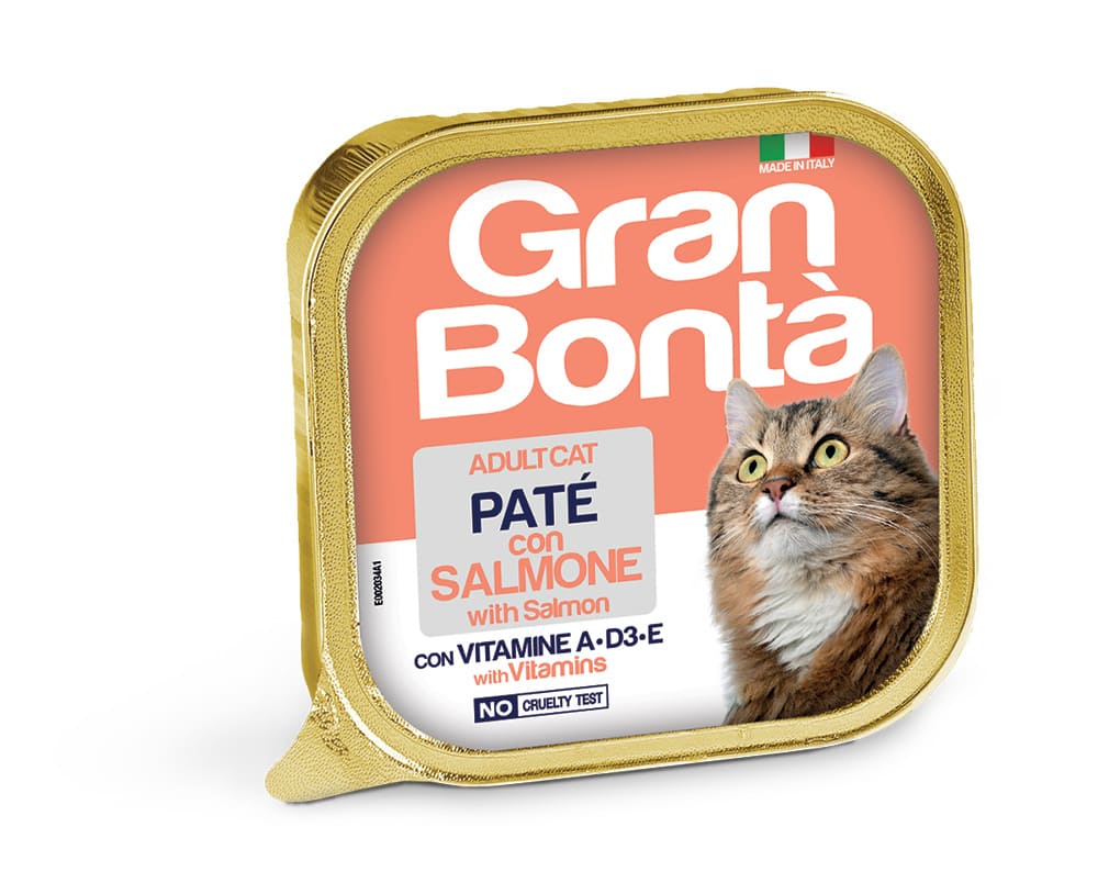 GRAN BONTÀ GATTO PATÉ CON SALMONE è un alimento completo per gatti adulti. Un gustoso paté delicatamente cotto al vapore e formulato con ingredienti facilmente digeribili come il salmone, fonte di proteine e minerali, per supportare la quotidiana vitalità dei gatti. Un’alimentazione bilanciata con vitamine A-D3-E per soddisfare le esigenze nutrizionali degli animali. Senza coloranti e conservanti artificiali aggiunti. Made in Italy e No Cruelty Test.