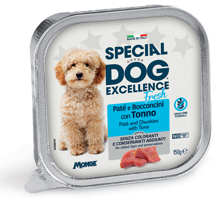 Special Dog Fresh Paté e Bocconcini con Tonno è un alimento completo, formulato con pesce fresco che unisce la cremosità del paté cotto al vapore con il sapore dei bocconcini cotti al forno. Appositamente studiato per offrire una nutrizione bilanciata con l’addizione di vitamine A-D3-E. Senza l’aggiunta di coloranti, conservanti e zuccheri. Made in Italy e No Cruelty Test.