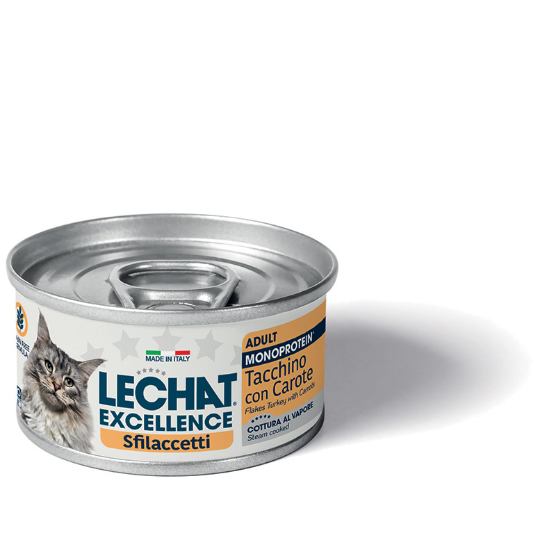 Tacchino 65% (pari al 100% della carne utilizzata), carote 4,2%, oli vegetali (olio di girasole raffinato), sostanze minerali.