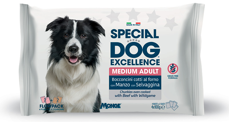 Comodo multipack contenente 4 buste da 100 grammi con gustosi bocconcini in salsa per cani adulti di taglia media in due diversi gusti: